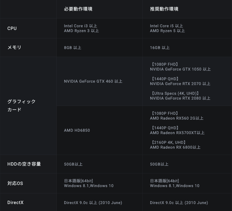 ゲームをプレイする上での必要な環境はそこまでスペックの高いものでなくても大丈夫です。